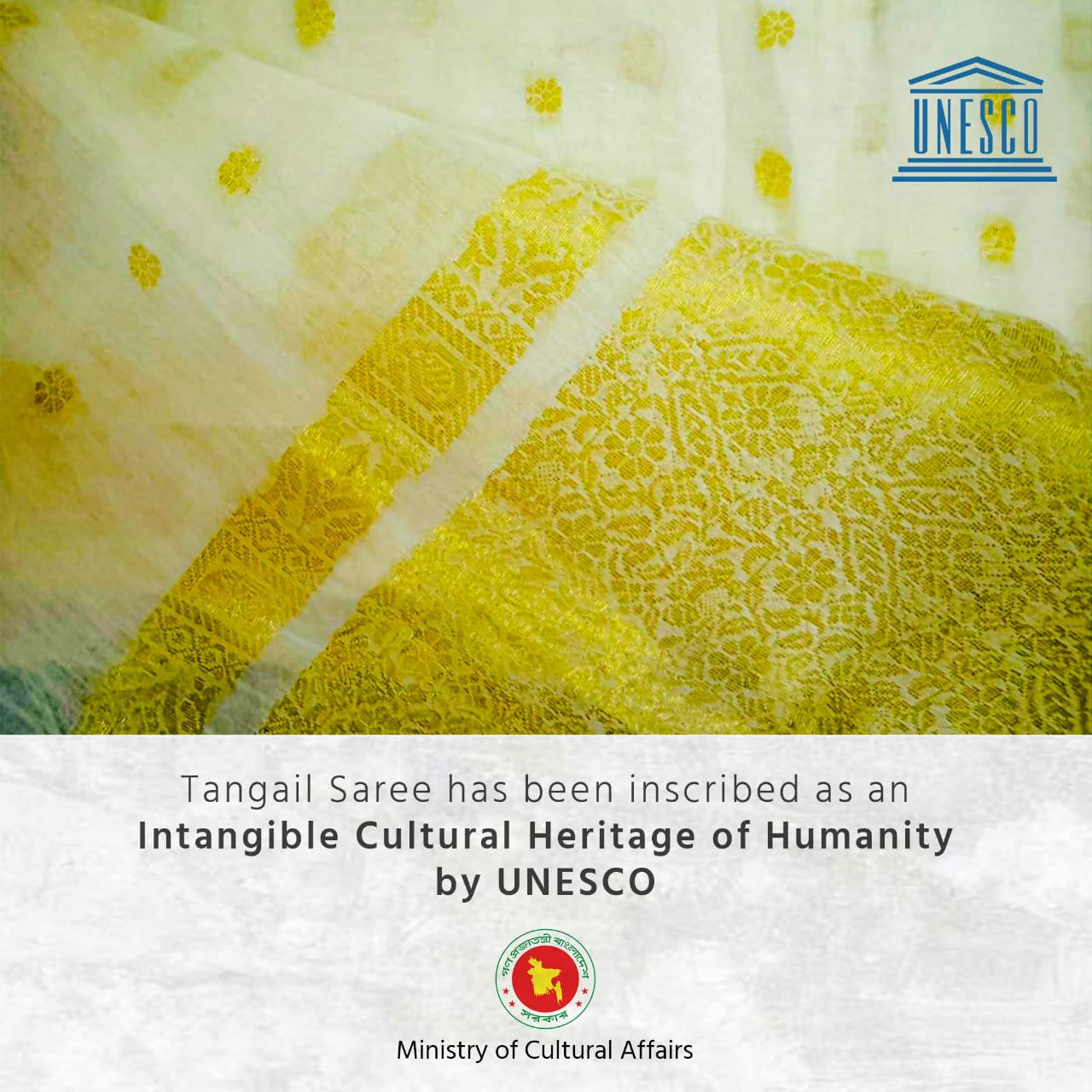 ইউনেস্কো কর্তৃক টাংগাইল শাড়িকে সাংস্কৃতিক ঐতিহ্য হিসেবে স্বীকৃতি দেওয়া হয়েছে।